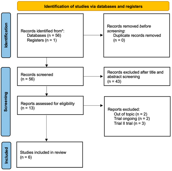 From our search, 56 studies were identified from 2019 to 2023. After title/abstract screening, 13 eligible articles were selected. According to inclusion and exclusion criteria, two articles were removed because they were out of topic, three articles because they were phase II studies, and two articles because the trials were ongoing. At the end of the screening, a total of six randomized phase III studies were included in our review (Figure 1) [17,18,19,20,21,22].