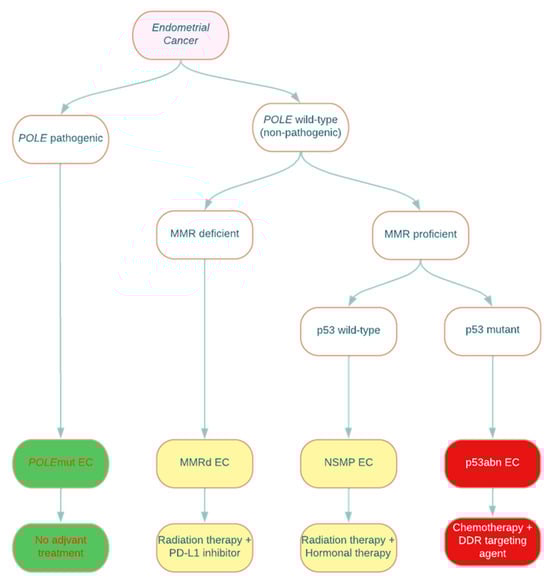 Molecular classification of endometrial cancer with associated suggested management. POLE: polymerase epsilon catalytic subunit; MMR: mismatch repair; POLEmut: polymerase epsilon-ultramutated; MMRd: mismatch repair deficient; NSMP: no specific molecular profile; p53abn: p53-abnormal; PD-L1: programmed death ligand-1; DDR: DNA damage response. The green subtype is associated with an excellent prognosis, the yellow subtype is associated with an intermediate prognosis, and the red subtype is associated with a poor prognosis [12].