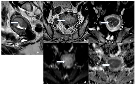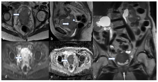 Stage IA2. A 53-year-old female patient with low-grade endometrioid carcinoma, sagittal T2 (a), axial T2 (b), axial post-contrast T1 (c), (d) DWI and (e) ADC MRI images show an ill-defined hypo-enhancing mass in the endometrial cavity (arrow) with restricted diffusion—the mass projects into less than 50% of the myometrium. Low-grade endometrioid carcinoma is a non-aggressive histological type, and when it involves less than half of myometrium, it is considered stage IA2.