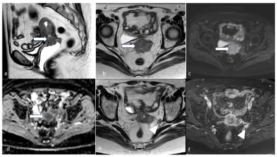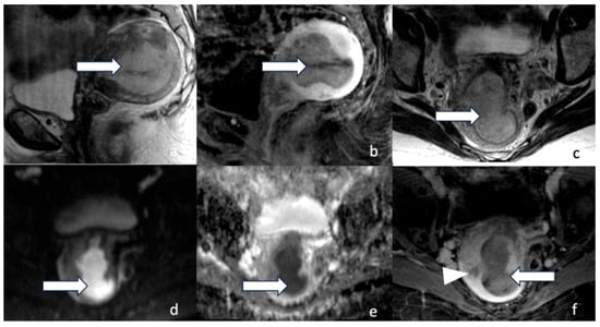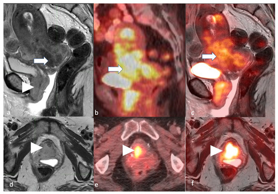 Stage IV. A 54-year-old female patient with endometrial carcinoma. Sagittal (a) and axial (d) T2 MRI images, sagittal (b) and axial (e) PET/CT images, and sagittal (c) and axial (f) T2-weighted PET/MRI images demonstrate an FDG avid (arrow) T2 intermediate hyperintense endometrial tumor involving the bladder base and urethra (arrowhead).