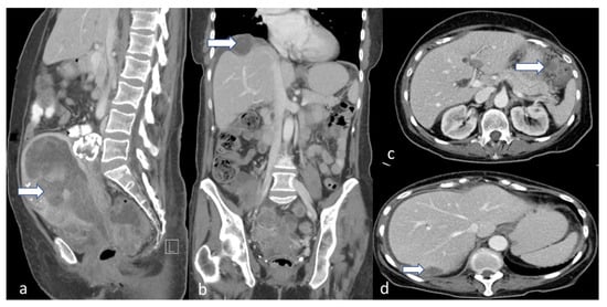 Stage IVB. A 65-year-old female with grade 2 low-grade endometrioid carcinoma. Sagittal (a), coronal (b), and axial (c,d) post-contrast CT venous phase images show an enlarged uterus with a large endometrial mass (arrow). Peritoneal implants are noted along the right subdiaphragmatic/perihepatic implant space and in the left upper quadrant (arrow in (b–d)).
