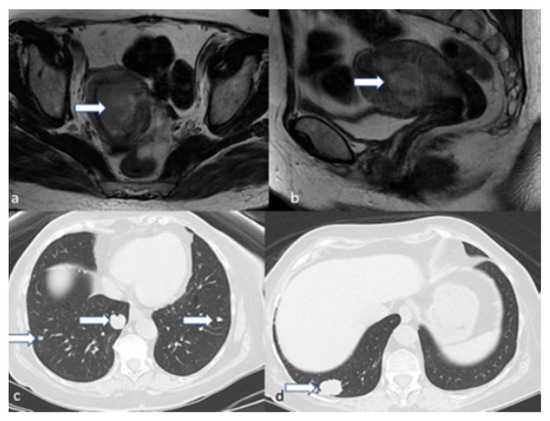 Stage IVC. A 44-year-old female patient with high-grade endometrioid carcinoma. Axial (a) and sagittal (b) T2 weighted MRI images show an endometrial mass (arrow). Axial CT of the chest (c,d) revealed multiple pulmonary metastatic nodules (arrows); the largest is at the right lower lobe.