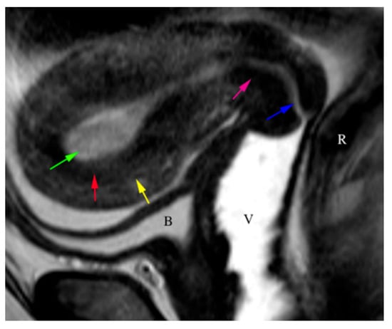The sagittal T2WI image demonstrates the normal trilaminar appearance of the uterus. The T2 hyperintense endometrium (green arrow), the hypointense junctional zone (red arrow), and the isointense myometrium (yellow arrow) create the trilaminar appearance. The cervix demonstrates a hyperintense endocervical canal (blue arrow) and hypointense cervical (pink arrow) stroma. Bladder (B), vagina (V), rectum (R).