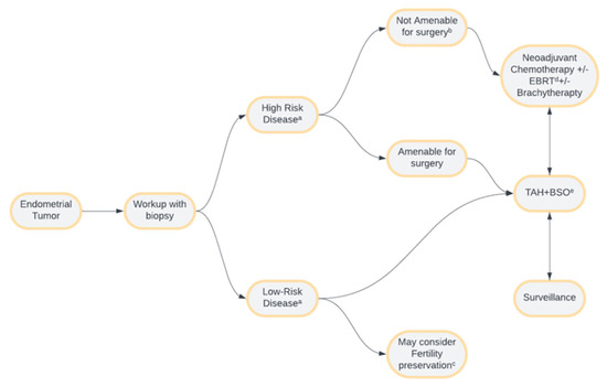 Endometrial cancer management overview. a High-risk disease involves any stage with an aggressive subtype and/or stage III or IV disease regardless of histological subtype. Low-risk disease involves stage I or stage II disease with a non-aggressive subtype. b Disease deemed unresectable by surgical evaluation or late-stage disease where risks of surgery outweigh the benefits. c Fertility preservation, though controversial, may only be considered in early-stage, low-risk diseases. d External beam radiation therapy. e Total abdominal hysterectomy with bilateral salpingo-oophorectomy.
