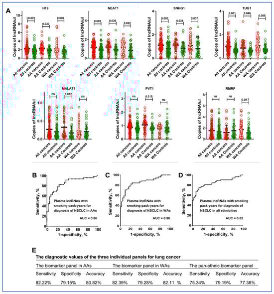Differential expression of lncRNAs in plasma and diagnostic performance for lung cancer by ethnicity. (A) Expression levels of lncRNAs in patient plasma: Scatter plots showing the plasma levels of seven lncRNAs-H19, NEAT1, SNHG1, TUG1, MALAT1, PVT1, and RMRP in AA and WA individuals. Red dots represent control individuals and green dots represent lung cancer patients. The black lines indicate mean expression levels. Statistical significance was determined using the Mann–Whitney U test; ns denotes not significant, and p-values are shown above the plots for significant comparisons. (B) Diagnostic performance for lung cancer in AAs: Receiver Operating Characteristic (ROC) curve for a biomarker panel including MALAT1, PVT1, SNHG1, and smoking pack-years, showing a high Area Under the Curve (AUC) of 0.86, indicating strong diagnostic ability for lung cancer in AA patients. (C) Diagnostic performance for lung cancer in WAs: ROC curve for a biomarker panel comprising RMRP, H19, NEAT1, and smoking pack-years, with an AUC of 0.87. (D) ROC curve for a pan-ethnic biomarker panel (SNHG1, NEAT1, TUG1, and smoking pack-years) applicable across all ethnicities, indicating a good diagnostic performance with an AUC of 0.82, which is lower than the ethnic-specific panels (all p < 0.05). (E) The diagnostic values of the three individual panels.