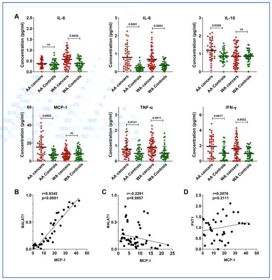 lncRNAs have been proposed to play a role in the immune mechanisms involved in tumorigenesis [25]. To explore whether MALAT1 contributes to immune responses in lung cancer among AAs, we evaluated cytokines in the same plasma sets and compared these with the results for lncRNAs. MCP-1 and IL-10 levels were specifically elevated in AA lung cancer patients (Figure 2A and Supplementary Table S4). In contrast, WA patients exhibited increased levels of IL-6. Notably, a significant correlation was found between MALAT1 and MCP-1 levels in the plasma of lung cancer patients from the AA population (r = 0.935, p = 0.001) (Figure 2B), a correlation not observed in the WA population (r = 0.229, p = 0.096) (Figure 2B,C). A high expression of PVT1 is also observed in lung cancer among AA patients; however, it is not associated with the cytokines, including MCP-1 (r = 0.201, p = 0.221) (Figure 2D).