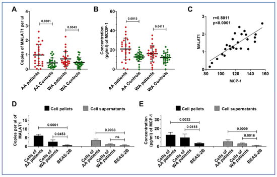 3.3. Overexpression of MALAT1 Is Associated with Monocyte Chemoattractant Protein-1 (MCP-1), a Chemokine, in AA Patients with Lung Cancer