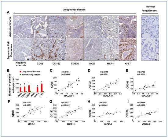 IHC analyses comparing lung tumor tissues to normal lung tissues for CD68, CD163, CD206, iNOS, MCP-1, and Ki-67 with negative controls ensuring specificity. (A) In tumor tissues, including AC and SCC, an increased expression of CD68, CD163, CD206, MCP-1, and Ki-67 is observed, whereas iNOS levels remain unchanged. Bar = 50 μm. (B) Quantitative analysis and correlation of the results presented in A, indicating the elevated expression of CD68, CD163, CD206, MCP-1, and Ki-67 within tumor tissues. *, all < 0.001. (C–H) Significant positive correlations between MALAT1 expression and M2 markers, and between MCP-1 and M2 markers, specifically in samples from AA lung cancer patients (all p < 0.001). (I) A significant positive correlation between the levels of CD206 and CD163, which are markers for M2 macrophages, in tissue samples from AA lung cancer patients (p < 0.001).