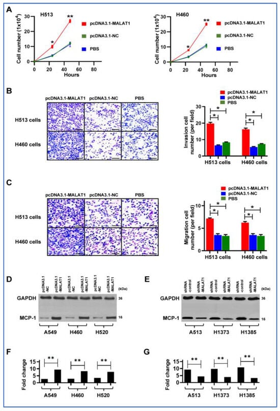 Effects of MALAT1 modulation on NSCLC cell behavior and MCP-1 levels. (A) Overexpression of MALAT1 (pcDNA3.1-MALAT1) in H513 and H460 cancer cells significantly increases cell proliferation compared to pcDNA3.1-NC negative control and PBS control (* p < 0.05, ** p < 0.01). Error bars indicate standard deviation from three experiments. (B) Invasive capabilities of H513 and H460 cells through a Matrigel-coated membrane are enhanced by MALAT1 overexpression, with quantitative results shown in the adjacent bar chart. Scale bar = 50 μm (* p < 0.05). (C) Increased cell migration in H513 and H460 cells with MALAT1 overexpression, as depicted in the bar graph. Scale bar = 50 μm (* p < 0.05). (D) Western blot analysis shows elevated MCP-1 protein levels in A549, H460, and H592 NSCLC cells with higher MALAT1 expression. The uncropped blots are shown in Supplementary Figure S3. (E) Reduction in MALAT1 expression via siRNA in H513, H1373, and H1385 cells decreases MCP-1 protein levels, demonstrated by Western blot analysis. The uncropped blots are depicted in Supplementary Figure S4. (F) Densitometry analysis of Western blot bands in Figure 5D confirms that increased MALAT1 expression correlates with higher MCP-1 protein levels in A549, H460, and H592 cells (** p < 0.01). (G) Densitometry analysis of Western blot bands in Figure 5E shows that reducing MALAT1 expression via shRNA in H513, H1373, and H1385 cells leads to decreased MCP-1 protein levels (** p < 0.01).