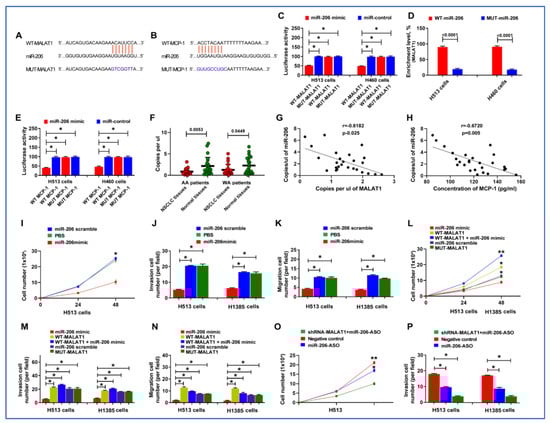 MALAT1 directly targets miR-206, influencing MCP-1 expression, and contributes to the lung tumorigenesis. (A,B) Bioinformatics analysis suggested that MALAT1 may directly target miR-206, and in turn, miR-206 may directly target MCP-1. (C) Dual luciferase reporter assay results showing the relative luciferase activity in H513 and H460 lung cancer cells. Cells were co-transfected with either WT- or MUT-MALAT1 constructs along with miR-206 mimic or control. Blue bars represent WT-MALAT1 constructs; red bars represent MUT-MALAT1 constructs. A reduction in luciferase activity is observed with WT-MALAT1 and miR-206 mimic co-transfection. *, all p < 0.05. (D) Enrichment of miR-206 in the RNA pull-down assay with biotinylated MALAT1 constructs. Blue bars represent the enrichment after pull-down with WT-MALAT1 constructs; red bars represent enrichment with MUT-MALAT1 constructs. (E) Dual luciferase reporter assay results showing the effect of miR-206 on the 3′UTR of MCP-1. Constructs with WT or MUT 3′UTR of MCP-1 were co-transfected into lung cancer cells with miR-206. Decreased luciferase activity with WT 3′UTR and miR-206 mimic suggests that miR-206 binds to MCP-1 3′UTR, leading to downregulation of the luciferase reporter. *, all p < 0.05. (F) The levels of miR-206 in lung cancer tissues compared to non-cancerous lung tissues. Lower levels of miR-206 expression were observed in lung cancer tissues. (G,H). Scatter plots depicting the inverse correlation between miR-206 copy number and expression levels of MALAT1 and MCP-1 in tumor tissues. Each dot represents a tissue sample, with the X-axis showing MALAT1 or MCP-1 levels and the Y-axis showing miR-206 copy number. (I) Proliferation assay showing cell numbers of lung cancer cells treated with either miR-206 mimic or miR-206 scramble control over a 48-h period. *, p < 0.01. (J) Invasion assay results for H513 and H1385 cells treated with PBS, miR-206 mimic, or miR-206 scramble, indicating reduced invasive capacity upon miR-206 mimic treatment. *, all p < 0.05. (K) Migration assay results for H513 and H1385 upon miR-206 mimic treatment. *, all p < 0.05. (L) Cell proliferation assays for H513 and H1385 cells treated with miR-206 mimic, WT-MALAT1, WT-MALAT1 plus miR-206 mimic, miR-206 scramble, or MUT-MALAT1 over 48 h. *, all p < 0.05; **, all p < 0.01. (M) Invasion assay for cancer cells treated with the above conditions, showing the mitigating effect of WT-MALAT1 overexpression on miR-206-induced suppression of invasion. *, all p < 0.05. (N) Migration assay for cancer cells treated with the above conditions, showing the mitigating effect of WT-MALAT1 overexpression on miR-206-induced suppression of migration. *, all p < 0.05, *, all p < 0.05. (O) Proliferation assay of H513 cells treated with sh-MALAT1 plus miR-206 ASO, negative control, or miR-206-ASO alone, showing restored proliferation with miR-206 ASO treatment. *, all p < 0.05; **, all p < 0.01. (P) Invasion assay for H513 and H1385 cells under the same treatment conditions as in (O), demonstrating the reversion of sh-MALAT1 tumor-suppressive effects by miR-206 ASO. *, all p < 0.05. Error bars represent the standard deviation of the mean from three experiments.