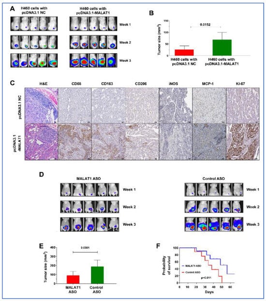 Impact of MALAT1 on lung cancer development and progression and the therapeutic efficacy of MALAT1 ASO. (A) Imaging of two groups of mice over three weeks showing the development of xenograft tumors. One group received injections of H460 lung cancer cells with MALAT1 overexpression, while the other group was injected with cells containing an empty vector (pcDNA3.1 NC). An early onset of tumor development is observed in the group with H460 lung cancer cells with MALAT1 overexpression, indicating a MALAT1-driven increase in tumorigenicity. (B) Tumors from the group which received injections of H460 lung cancer cells with MALAT1 overexpression are larger, corroborating the bioluminescence data. (C) Hematoxylin and eosin staining displays the histological structure of lung tumors. Immunohistochemical staining shows that MALAT1-overexpressing tumors exhibit enhanced levels of MCP-1, CD68, CD163, and KI-67 when compared to control. Bar = 50 μm. (D) Bioluminescence imaging of mice post-treatment showing tumor regression in group treated with MALAT1 ASOs compared to control ASO group. (E) Measurement of tumors at the end of the treatment, highlighting a significant decrease in tumor volume in the MALAT1 ASO-treated group versus control (p = 0.031). (F) Survival curves for the two groups of mice, one treated with MALAT1 ASO and the other with control ASO. The curve demonstrates a significant survival advantage in the MALAT1 ASO-treated group (Kaplan–Meier survival analysis).