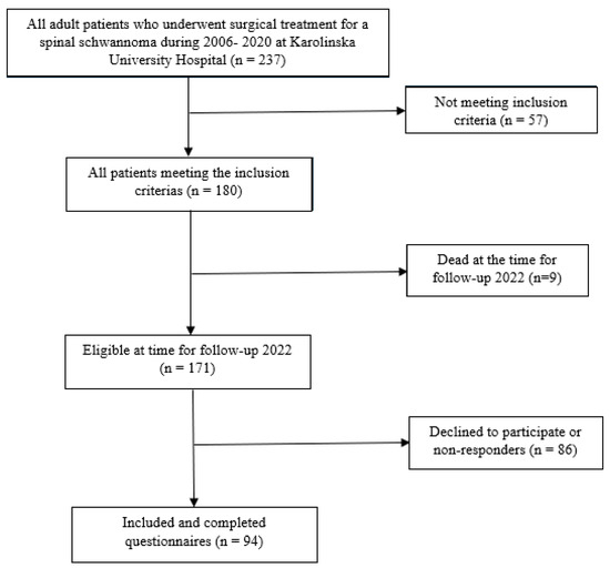 All adult (≥18 years) patients operated for a spinal schwannoma at the Karolinska University Hospital during a period of 15 years (2006–2020) were identified in a previous study including 180 patients [1]. Of these 180 patients, 171 were still alive in 2022 and were contacted with a request for participation in this follow-up study. A total of 86 patients declined to participate or did not respond. Thus, 94 spinal schwannoma patients were included in the study (55% of eligible patients; Figure 1).