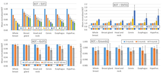 Impact of variations in the AT, LOT cutoff, NTO weight, and number of optimization rounds on BOT. Values are averaged over the six patients for each location. The AT variation values are averaged over the three LOT values, and the LOT variation values are averaged over the six AT values. The values are normalized to the first value of each parameter studied to analyze the variation in the parameters. The error bars represent one standard deviation.