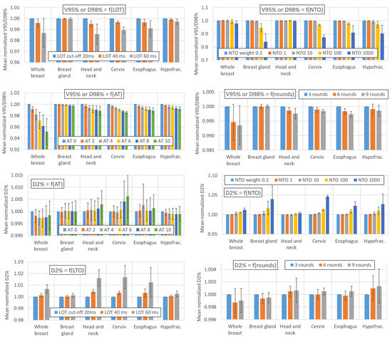 Figure 1 and Figure 2 show the impact of variations in the AT, LOT cutoff, NTO, and number of optimization rounds, respectively, on the BOT and PTV dosimetric indices. For simultaneous integrated boost (SIB) locations, only the PTV with the highest dose is considered. The impact of these parameters on the main OAR dosimetric indices is illustrated in Figure 3 (neither all the indices listed in Appendix B nor the number of optimization rounds are shown for clarity; these data can be found in the data repository and in Appendix D). Each value is the average value of the six patients for each location. The AT variation values are averaged over the three LOT values, and the LOT variation values variation values are averaged over the six AT values. The values are normalized to the first value of each studied parameter to analyze the variation in the parameters.