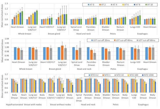 Impact of variations in the AT, LOT cutoff, and NTO weight on the OAR dosimetric indices. Not all OARs are reported for clarity. The values are averaged over the six patients for each location. The AT variation values are averaged over the three LOT values, and the LOT variation values are averaged over the six AT values. The values are normalized to the first value of each parameter studied to analyze the variation in the parameters. The error bars represent one standard deviation.