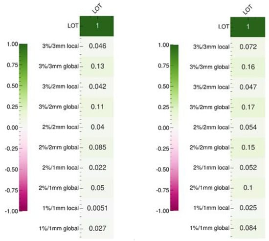 Pearson (left) and Spearman (right) correlation test results between the LOT cutoff and gamma index values according to the dose/distance criteria.