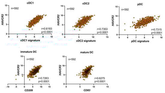 We investigated whether the infiltration of DCs was associated with HAVCR2 expression (which encodes TIM-3) in CRC using the TCGA dataset. The results obtained revealed correlations between HAVCR2 expression levels and a panel of DC signatures (Figure 1). For example, HAVCR2 correlated with the cDC1 signature consisting of CLEC9A, XCR1, BATF3, and CLNK [], with the cDC2 signature consisting of CD1A, CLEC1B, FCER1A, CD1E, and CLEC10A [,], and also with the pDC signature consisting of IL3RA, TCR9, and LILRA4 [,]. Furthermore, correlations were observed between HAVCR2 and CD209 (an immature DC marker) and between HAVCR2 and CD83 (a mature DC marker).