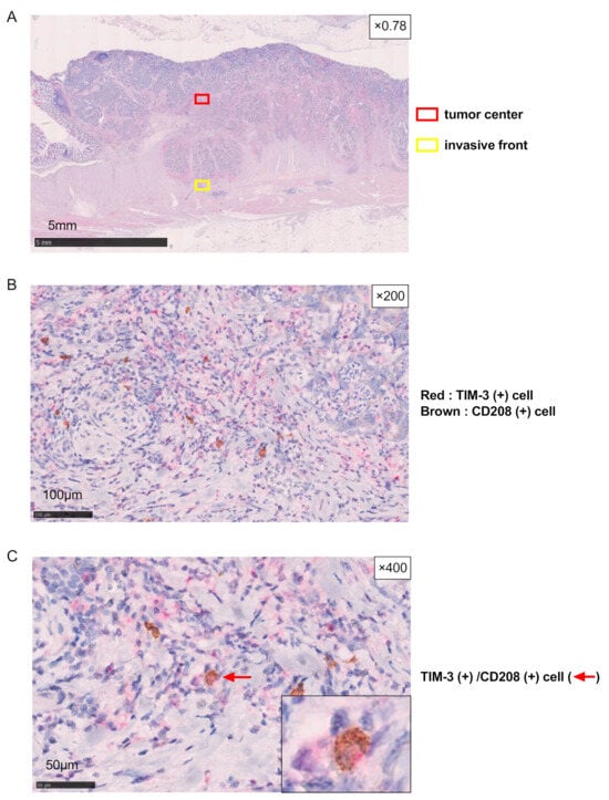 Digital images were acquired with a digital slide scanner (NanoZoomer-SQ; Hamamatsu Photonics, Shizuoka, Japan). Scanned images were independently evaluated by two observers (M. Sakuma and S. Nakajima) who had no prior knowledge of any clinical data. CD208-positive (+) cells were identified by brown staining and TIM-3 (+) cells by red staining. Four independent areas in each tumor center and the invasive front region of each tumor were randomly reviewed and evaluated by counting the number of CD208 (+) cells and both CD208 and TIM-3 (+) cells at a magnification of ×200.
