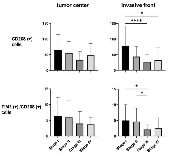 Numbers of CD208 (+) cells and TIM-3 (+)/CD208 (+) cells at both the tumor center and invasive front (n = 115). The Kruskal–Wallis test with Dunn’s post hoc test. * p < 0.05, **** p < 0.0001.