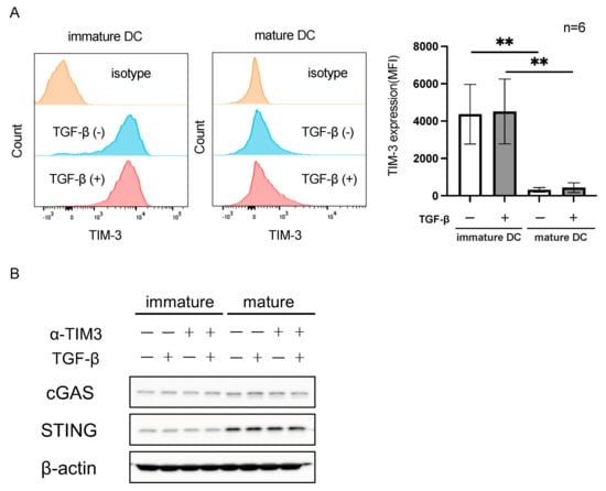 TIM-3 expression on DCs and TGF-β-treated DCs. (A) Representative histograms for immature and mature DCs are shown, and the expression levels of TIM-3 on immature and mature DCs were compared using a paired t-test (n = 6). ** p < 0.01. (B) Expression of cGAS and STING on immature and mature DCs by Western blotting, treated with TGF-β and anti-TIM-3 mAb (α-TIM3) without ligand stimulation as indicated.