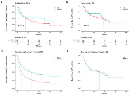 PFS and OS with and without time-varying covariate: (a) Kaplan–Meier curves of PFS for all the patients, stratified by CS vs. CS-SSIA. (b) Kaplan–Meier curves of OS for all the patients, stratified by CS vs. CS-SSIA. (c) Cox regression of PFS for all the patients, stratified by CS vs. CS-SSIA, accounting for time-varying covariate. (d) Cox regression of OS for all the patients, stratified by CS vs. CS-SSIA, accounting for time-varying covariate.