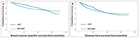 - García-Fernández, A.; Lain, J.M.; Chabrera, C.; García Font, M.; Fraile, M.; Barco, I.; Torras, M.; Reñe, A.; González, S.; González, C. Comparative long-term study of a large series of patients with invasive ductal carcinoma and invasive lobular carcinoma. Loco-regional recurrence, metastasis, and survival. Breast J. 2015, 21, 533–537. [Google Scholar] [CrossRef]