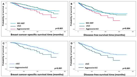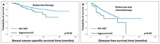 - Chamalidou, C.; Fohlin, H.; Albertsson, P.; Arnesson, L.-G.; Einbeigi, Z.; Holmberg, E.; Nordenskjöld, A.; Nordenskjöld, B.; Karlsson, P.; Linderholm, B. Survival patterns of invasive lobular and invasive ductal breast cancer in a large population-based cohort with two decades of follow up. Breast 2021, 59, 294–300. [Google Scholar] [CrossRef]