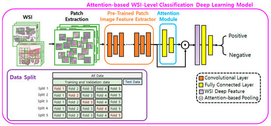 The deep learning method used in this study is the same as that employed in our previous study [31]. We developed an attention-based WSI-level classification deep learning model to predict whether a WSI is LNM positive or negative (Figure 1). The model was trained for a binary classification task, where the input was a WSI, and the output was the probability of the WSI being LNM-positive.