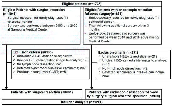 A total of 1737 patients with T1 CRCs (1046 surgical resections and 691 endoscopic resections followed by surgery) were eligible for this study, and 456 patients were excluded. Thus, 1281 patients (881 surgical resections and 400 endoscopic resections followed by surgery) were analyzed (Figure 2). Their baseline clinicopathological characteristics are presented in Table 1. The median age at CRC diagnosis was much younger in patients with endoscopic resection followed by additional surgery (59.0; IQR, 52.0–65.0) than in patients with surgical resection (60.0; IQR, 52.0–69.0). Men accounted for 59.6% of the total population. The percentage of patients with a family history of CRC, ex-/current smoker, or alcohol ex-/current drinker was higher in endoscopic resection followed by additional surgery. Patients without a family history of CRC accounted for 89.2% of the patients. High-risk pathologic features related to LNM, including LVI, tumor budding, positive resection margin, and microsatellite instability, were more in patients with endoscopic resection followed by additional surgery than surgical resection.