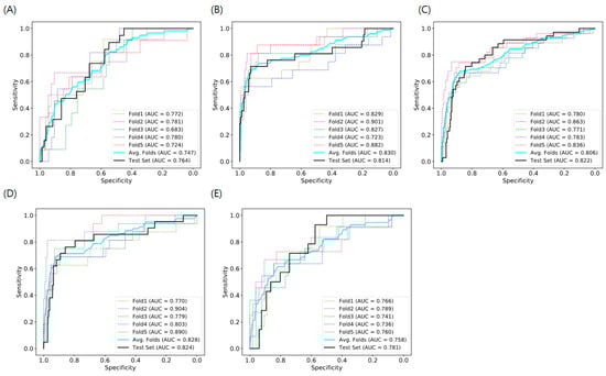 Area under the ROC curve for attention-based WSI-level classification deep learning model for predicting lymph node metastasis in T1 colorectal cancer. (A) Previous model, (B) Version 1, (C) Version 2, (D) Version 3, (E) Version 4 ROC, receiver operating characteristic; WSI, whole-slide image; Version 1, train and test: surgical specimen; Version 2, train and test: endoscopic and surgical specimen; Version 3, train: endoscopic and surgical specimens and test: surgical specimen; Version 4, train: endoscopic and surgical specimens and test: endoscopic specimen; AUC: area under the curve; Avg: average.