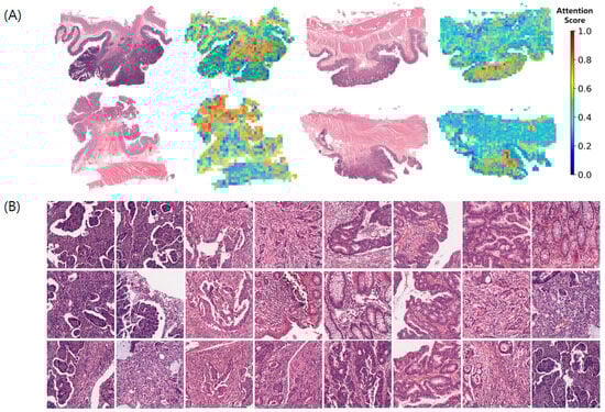 Attention score visualization in WSIs of positive lymph node metastasis. (A) Spatial distribution of attention scores on the WSIs, (B) Patch-images stratified by high attention scores WSIs, whole slide images.
