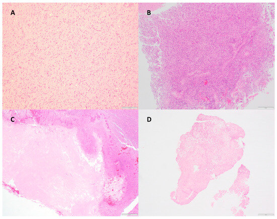 H&E sections demonstrating (A) diffuse astrocytic gliomas, histologically grade 3 with molecular feature of GBM (TERT promoter variant) (100× magnification); (B) glioblastoma, IDH-wildtype, with 90% tumor cellularity/10% necrosis (40× magnification); (C) glioblastoma, IDH-wildtype, with 90% tumor cellularity/60% necrosis (40× magnification); (D) glioblastoma, IDH-wildtype, with 90% tumor cellularity/90% necrosis (20× magnification).