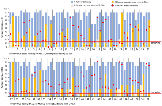 Overview of intratumoral cellularity, necrosis and MGMTp methylation percentages across 52 primary HGG cases with repeated MGMTp testing. Horizontal red lines indicate the borderline MGMTp zone (9–13%).