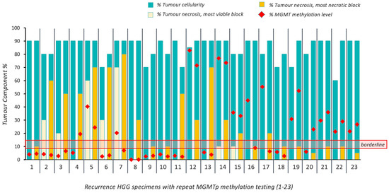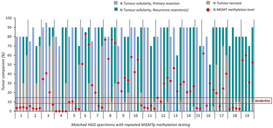 Overview of tumoral cellularity, necrosis and MGMTp methylation percentages in 19 cases of recurrent HGG (16 recurrences; 3 re-resected recurrences). Horizontal red lines indicate the borderline MGMTp zone (9–13%).