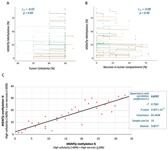 Statistical significance was set at p < 0.05. Comparisons between median MGMTp methylation percentages were performed using Mann–Whitney U tests. We used repeated measures correlation (rmcorr) analyses using the rmcorrShiny app (https://lmarusich.shinyapps.io/shiny_rmcorr/, accessed on 16 March 2024) to calculate within-individual associations of different levels of tumor necrosis (%) and repeated assessments of MGMTp methylation in a total of 163 tumor specimens (primary and recurrences) [42,43]. Spearman’s rank correlation coefficient was used to compare methylation percentages between different levels of tumor cellularity and necrosis. Although the treatment details and survival outcomes were available (Supplementary Table S1), survival analyses were not performed due to the deliberate selection bias toward methylated MGMTp cases in order to assess the effect of necrosis.
