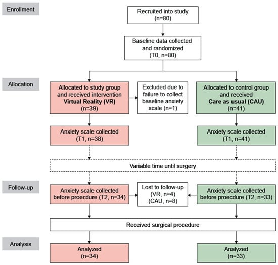 Figure 1 shows a flow diagram of the study. Eighty patients were recruited and allocated to the VR group (n = 39) and CAU group (n = 41). One patient in the VR group was excluded after T0, because the baseline anxiety scale was not administered before randomization. Twelve patients (VR, n = 4; CAU, n = 8) were lost-to-follow-up. Thus, a total of 67 patients (VR, n = 34; CAU, n = 33) were included in the final analysis.