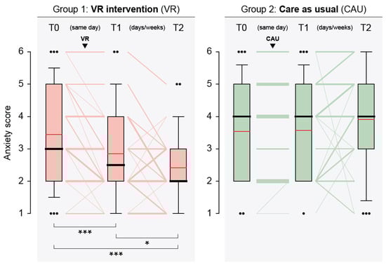 Graphical representation of anxiety levels of patients in the virtual reality intervention (VR) and care as usual (CAU) groups at the assessment timepoints (T0, baseline; T1, after VR/CAU (same day as T0); T2, before surgical procedure, days or weeks after T0/T1). Box plots: boundaries of the boxes, 25th/75th percentiles; thick horizontal lines, medians; red horizontal lines, means; whiskers, 10th and 90th percentiles; dots, outliers (when >3 outliers, only one dot is shown with the number of outliers given in parenthesis). Line plots: line thickness is proportional to the number of subjects with the same path. A statistically significant difference of anxiety scores between time points (indicated by brackets) is shown at the bottom (Wilcoxon signed rank test): ***, p < 0.001; *, p < 0.5.