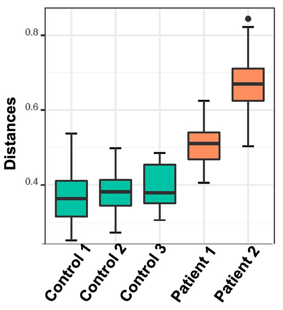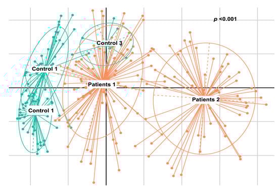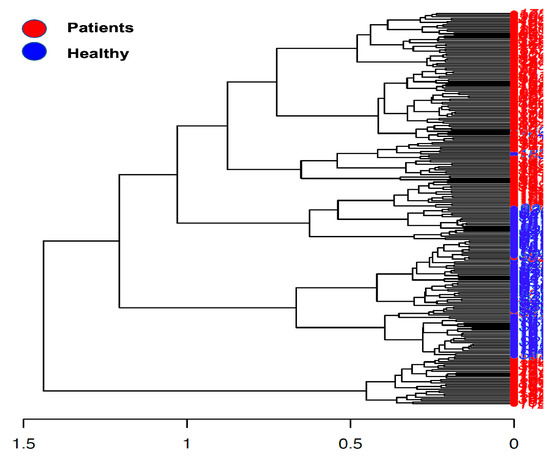 Beta diversity calculation was performed to quantify the similarity of microbial communities among various samples using the OTU table. This calculation relied on permutational multivariate analysis of variances (PERMANOVA), employing multiple distance matrices based on phylogenetic distances between observed samples. The results revealed significant differences between patients and healthy cohorts (p < 0.001, Figure 1). The constructed phylogram illustrates the relationships among the various sample sets, clearly showing a distinct separation between patients and healthy individuals (Figure 2).
