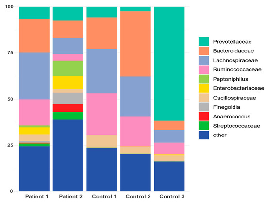 Taxonomic profile representing the cumulative relative abundance (%) at the family level for both patients and healthy controls.