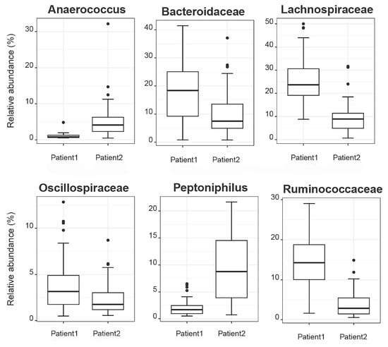 Aiming to investigate differences in the abundances of microbial populations among the groups of patients, boxplots were created using Rhea, and the taxa with significant differences in the relative abundance (%) are presented in Figure 7. In brief, microbial taxa belonging to the families of Bacteroidacea, Lachnospiraceae, Oscillospiraceae, and Ruminococaceae were more abundant in the Patient 1 cluster, whereas Anaerococcus and Peptoniphilus were more abundant in the Patient 2 cluster. Additionally, when comparing the patients with the reference controls, all taxa belonging to Bacteroidaceae, Oscillospiraceae, Rikinellaceae, Ruminococcaceae, and Veillonellaceae families presented a higher relative abundance in the reference controls, even though the effective richness was higher in patients (Figure 8).