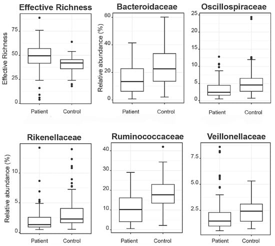 Boxplots demonstrate the effective richness and the relative abundances of microbial taxa that present differences among patients and reference controls.