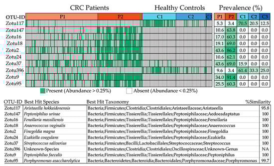 Furthermore, an additional analysis was conducted to examine the distribution and prevalence of specific zero-radius OTUs (zOTUs) within the samples, particularly focusing on those with abundances surpassing 0.25% (Figure 9). By grouping the samples based on the clusters they belong to, the study aimed to identify patterns and associations between zOTUs and their respective clusters. Additionally, the analysis sought to provide insight into the taxonomic classification of these zOTUs at the species level, utilizing the EzBioCloud database for reference. Overall, the analysis aimed to elucidate the composition and characteristics of microbial communities within the samples, with a specific focus on the identified zOTUs. In brief, the plot consists of individual data points, each representing a sample from the dataset. The green samples have an abundance of certain microbial taxa, specifically zOTUs, that exceed 0.25%. This suggests that these microbial taxa are relatively abundant in these samples compared to others. Based on the obtained plot, it can be inferred that zOTU117 (Aristeaella hokkaidonensis) and zOTU396 (an unknown species belonging to the Oscillospiraceae family) are most prevalent in the healthy setting (Figure 9). Conversely, Peptoniphilus urinae, Fenollaria massiliensis, Anaerococcus vaginalis, Finegoldia magna, Ezakiella coagulans, Streptococcus salivarius, Peptoniphilus faecalis, and Porphyromonas asaccharolytica were exclusively detected in patients with CRC, with a higher abundance observed in the Patient 2 cluster. The sole exception is Str. salivarius, which was also present in the Control 2 cluster but at a much lower abundance than in the patient cluster.