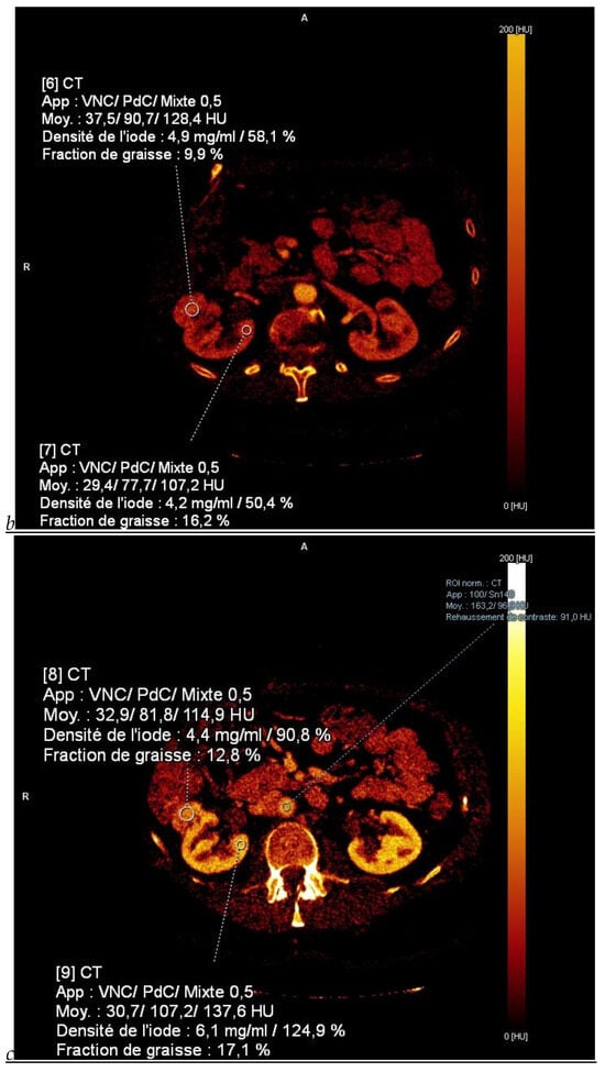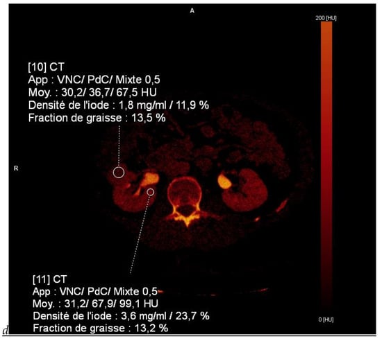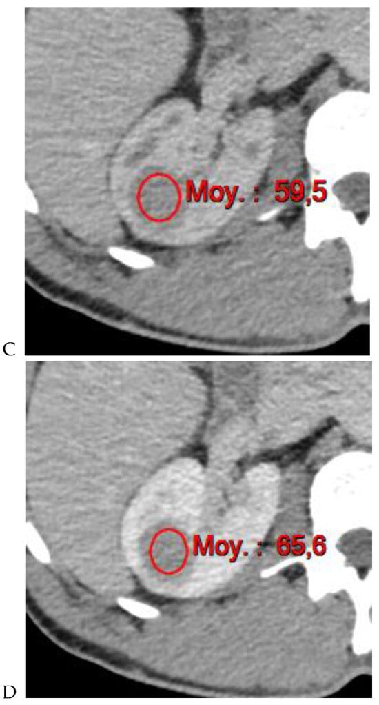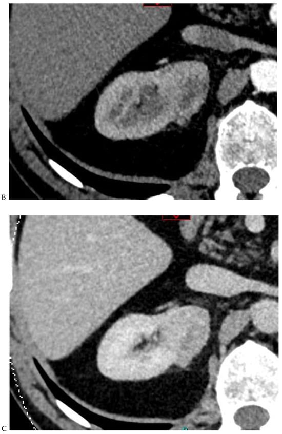 Differentiation algorithms facilitate the isolation or distinction of specific materials within the data set, often through color coding. Image post-processing algorithms can generate synthetic virtual unenhanced (VUE) images by removing the iodine signal from contrast-enhanced scans, reducing the need for additional scans and minimizing the radiation dose. In a series of 221 patients with 273 renal masses, the differences in renal mass attenuation between VUE and true unenhanced images were within 3 HU for enhancing masses (95% limits of agreement −3.1 HU to 2.7 HU) and non-enhancing cysts (95% limits of agreement −2.9 HU to 2.5 HU) [25]. In addition, the elimination of true enhanced acquisition would result in an estimated mean radiation dose savings of 24% (range 10–36%) for CT renal mass examinations [25]. A large, recently published retrospective study [26] confirmed that there is a strong agreement between VUE and true unenhanced images in the assessment of renal masses. This is important because unenhanced images provide essential information for the classification of renal cystic lesions and the detection of macroscopic fat, hemorrhage, and calcifications and serve as a baseline for comparison with contrast-enhanced images. Numerous studies have shown that CT numbers of virtual unenhanced images are reproducible and comparable to true non-contrast images, allowing the reliable assessment of precontrast renal lesion attenuation [26,27,28]. Nevertheless, Graser et al. [28] observed a difference in attenuation of ≥5 Hounsfield units (HU) between virtual and true unenhanced images in approximately 20% of patients in one study. In addition, significant interscanner variation in attenuation measurements and qualitative assessment of VUE images has been reported [29], particularly in patients scanned on different dual-energy CT scanner types during follow-up imaging. Chandarana et al. [30] also found variability in renal lesion attenuation between virtual and true unenhanced images. Given these findings, it cannot be definitively concluded that VUE images can replace true non-contrast scans. In fact, the effects of reconstruction algorithms, noise reduction techniques, and convolution kernels on the attenuation values of virtual unenhanced and weighted average data remain incompletely understood.