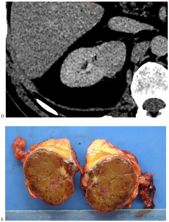 Oncocytoma in the right kidney of a 42-year-old man. (A) On the unenhanced image, the 4.8 cm lesion is isodense relative to the renal parenchyma. Enhancement is seen on the corticomedullary phase image (B), followed by washout on the nephrographic (C) and excretory (D) phase images. (E) Macroscopic view of the lesion after radical nephrectomy. Courtesy of Pr S. Ferlicot, Department of Pathology, Bicêtre.