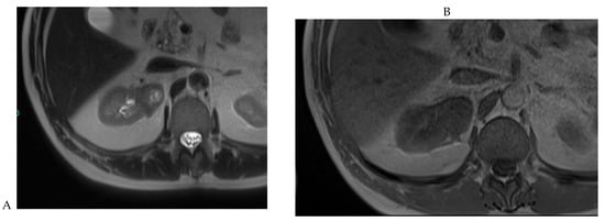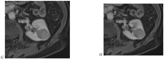 Cornelis et al. [12,20] proposed a stepwise reading of images organized as follows: (1) T2w images; (2) dual-shift chemical shift MR images; (3) DWI; (4) wash-in analysis of DCE images; and (5) washout analysis of DCE images. The first key feature is the predominant qualitative signal intensity of the lesion on a non-fat-suppressed T2-weighted sequence relative to the renal parenchyma. AMLs with minimal fat content and papillary RCC have a low SI on T2-weighted images, whereas most other solid tumors appear hyperintense or heterogeneous. In addition, chromophobe RCC often appears as a heterogeneous lesion (Figure 8) with a slightly low T2 SI, which allows differentiation from clear cell RCC or renal oncocytoma [39].