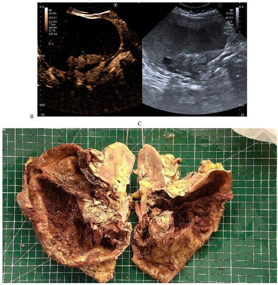 Papillary renal cell carcinoma in the right kidney of a 54-year-old woman. (A) B-mode ultrasound shows a large right cystic renal mass with heterogeneous contents and a dependent sediment. (B) CEUS with Sonovue® (Bracco Imaging France, Massy, France) reveals the presence of a solid enhancing component at the posterior aspect of the mass. (C) The mass was resected. Pathology identified a necrotic papillary renal cell carcinoma. Courtesy of Pr S. Ferlicot, Department of Pathology, Bicêtre Hospital.
