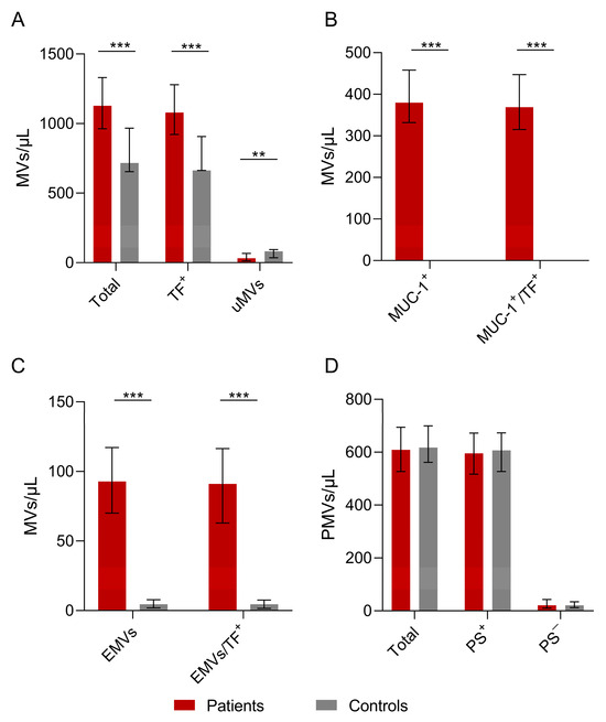 The number of microvesicles in patients’ plasma versus controls. (A) The total number of patients’ MVs vs. controls. The numbers of total MVs and TF-positive MVs were higher in patients vs. controls (p = 0.000025 vs. p = 0.000068). The number of unknown microvesicles (uMVs) was higher in controls than in the patient group (p = 0.008). (B) Numbers of MUC-1-positive and MUC-1/TF combined MVs were increased in the patients compared to the controls (p = 0.000001). (C) Statistically significant differences in EMVs and TF-positive EMVs between patients and controls (D) Total PMVs, PS+ PMVs, and PS− PMVs were not significantly different between patients and controls. Values are shown are medians (bar plots), and error bars represent ± interquartile ranges. *** p < 0.001; ** p < 0.01.