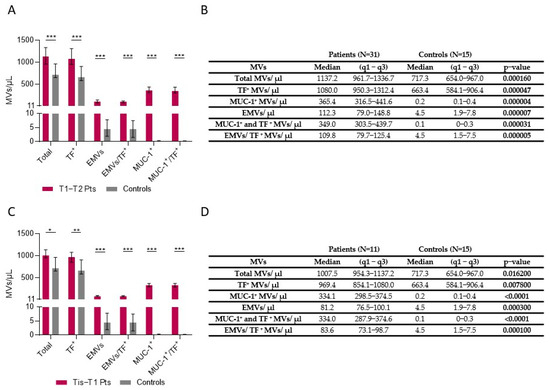 Number of MVs in plasma of Tis-T1-T2 patients vs. controls. (A) Patients with early-stage CRC (T1-T2) had higher numbers of total MVs (p = 0.00016), Tissue Factor (TF)-positive MVs (p = 0.000047), endothelium-positive (p = 0.000007) MVs (EMVs), combined EMV/TF MVs (p = 0.000005), MUC-1 positive MVs (p = 0.000004), and MUC-1/TF combined MVs (p = 0.000031) vs. controls. (B) MV counts in patients with stages T1 and T2 vs. controls. (C) Patients with a very early stage (Tis) of colon cancer (Tis-T1) also had higher numbers of total MVs, TF-positive MVs, EMVs, combined EMV/TF MVs, MUC-1-positive MVs, and combined MUC-1/TF MVs compared to controls (all p < 0.05). (D) MVs in patients with Tis and stage T1 compared to controls. Values shown in graphs are medians (bar plots), and error bars represent ± interquartile ranges. *** p < 0.001, ** p < 0.01, and * p < 0.05.