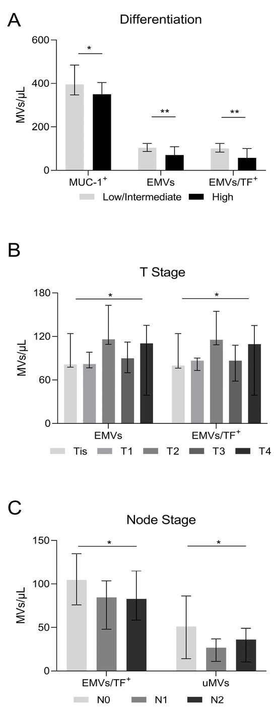 Microvesicle number in relation to cancer differentiation and lymph node invasion. (A) Highly differentiated tumors had lower MUC-1-positive MVs (350/μL vs. 418/μL in low/intermediate, p = 0.027); endothelial cell-derived microvesicles (EMVs) (70/μL vs. 115/μL in low/intermediate, p = 0.0027), and combined EMV/TF MVs (57/μL vs. 110/μL in low/intermediate, p = 0.0018). (B) MVs in relation to the tumor size. EMVs detected either alone or in combination with TF-positive MVs showed differences (Tis patients: EMVs = 81.2/μL and EMV/TF MVs = 79.7/μL; T1 patients: EMVs = 81.8/μL and EMV/TF MVs = 86.4/μL; T2 patients: EMVs = 116/μL and EMV/TF MVs = 115.4/μL; T3 patients: EMVs = 90.1/μL and EMV/TF MVs = 86.4/μL; T4 patients: EMVs = 110.4/μL and EMV/TF MVs = 109.4/μL; p = 0.04 and p = 0.02, respectively). (C) Patients with lymph node invasion had lower counts of EMV/TF combined positive MVs and uMVs. (Node = 0: EMV/TF MVs = 104.7/μL and uMVs 51.1/μL; Node = 1: EMV/TF MVs = 84.7/μL and uMVs 26.8/μL; Node = 2: EMV/TF MVs = 82.9/μL and uMVs 36.2/μL; p = 0.03 and p = 0.04, respectively). Values are medians (bar plots), and error bars represent a ± interquartile range. ** p < 0.01, and * p < 0.05.