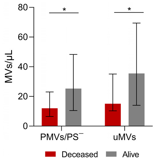 Analysis of microvesicles and blood test measurements in surviving and deceased patients. Phosphatidylserine (PS)-negative platelet MVs (PMVs) and unknown MVs in patients who survived and patients who died. Patients who remained alive had more PS-negative PMVs and more uMVs. PMVs: Alive—25.2/μL; Deceased—12.0/μL; p = 0.03. unMVs: Alive—35.5/μL; Deceased—15.1/μL; p = 0.02). Values are medians (bar plots), and error bars represent ± interquartile ranges. * p < 0.05.